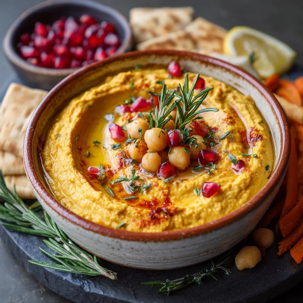 A comforting and healthy pumpkin hummus that combines chickpeas and pumpkin purée with warm spices, perfect for fall gatherings.