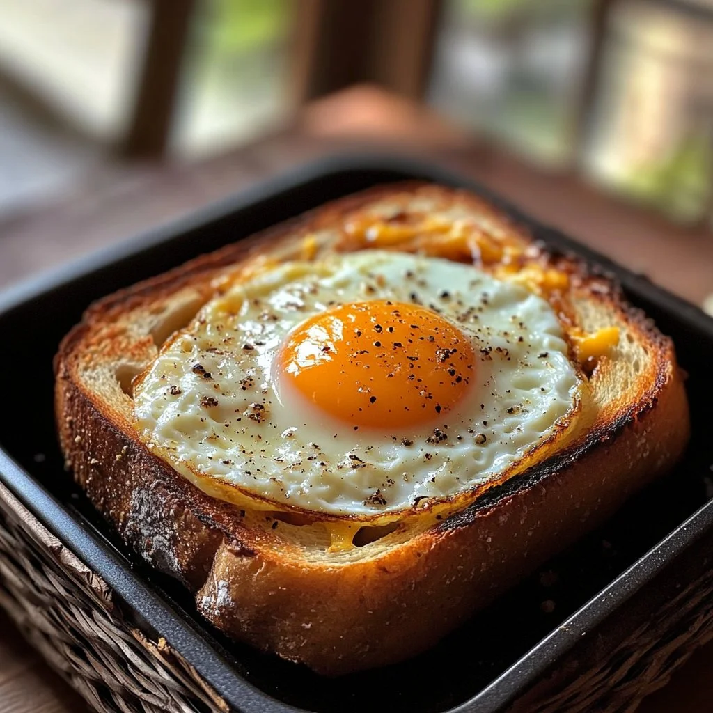 A quick and delicious breakfast of crispy bread topped with a perfectly cooked egg and melted cheese, customizable with optional toppings.