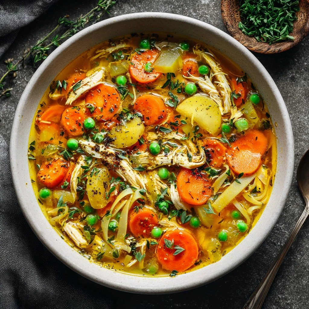 A comforting and nourishing chicken soup packed with anti-inflammatory ingredients like turmeric and ginger, perfect for chilly days.