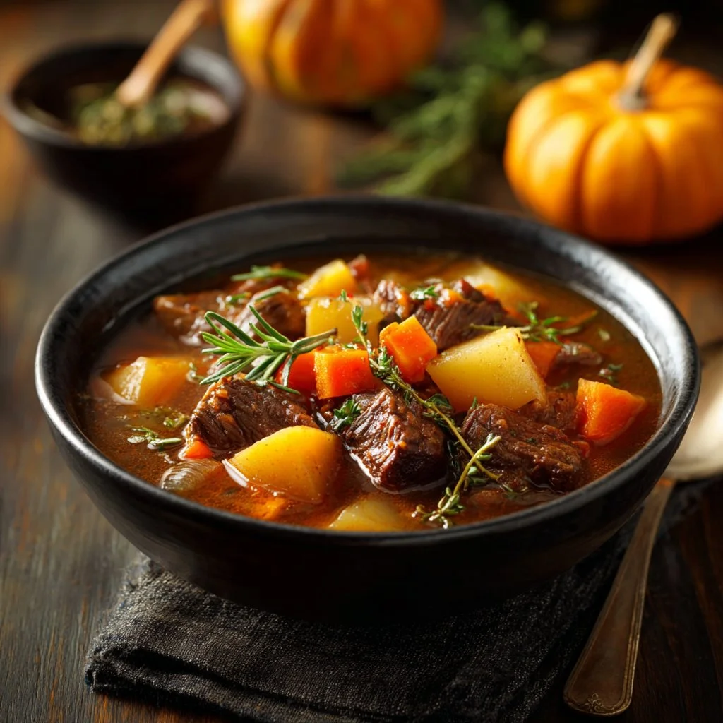 A heartwarming beef stew featuring tender beef and seasonal vegetables, perfect for cozy autumn evenings.