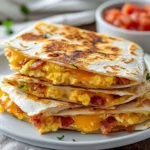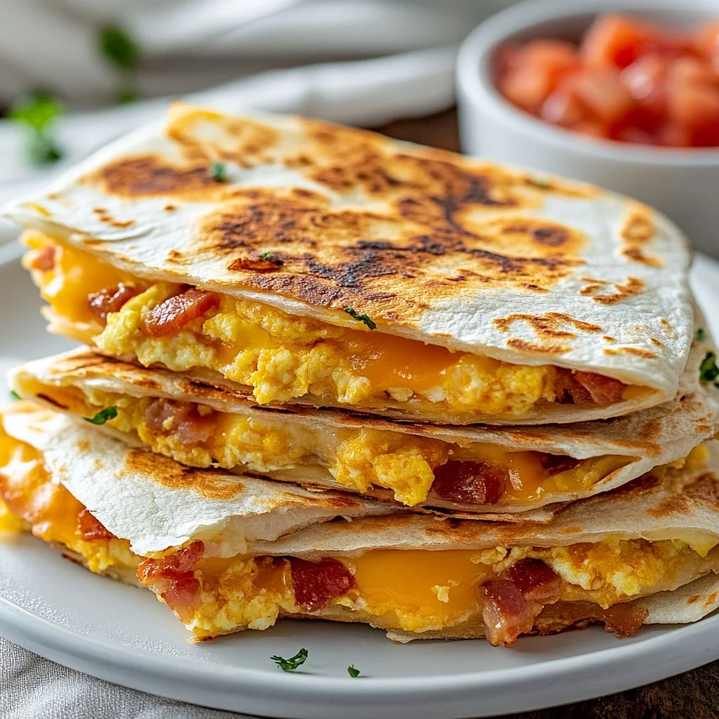 Delicious breakfast quesadillas filled with crispy bacon, fluffy scrambled eggs, and gooey cheese, perfect for lazy weekend mornings.