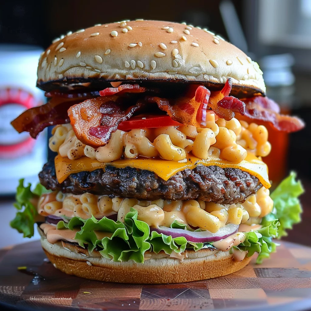 The Bbq Bacon Mac ‘n’ Cheese Stuffed Burger combines classic comfort food elements with a modern twist. Ground beef forms the base, offering a rich, savory flavor that pairs beautifully with the creamy mac ‘n’ cheese stuffing. The barbecue sauce enhances the taste with a tangy sweetness, while the bacon adds a crispy, smoky layer.