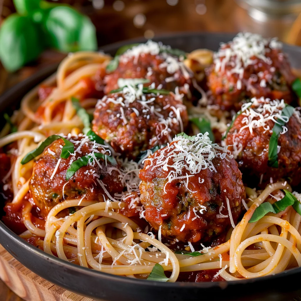- **Combine and Serve** – Pour the sauce and meatballs over the cooked spaghetti and gently mix to combine. To serve family-style, place on a large platter, sprinkle with additional Parmesan cheese and fresh basil, and enjoy it hot.
