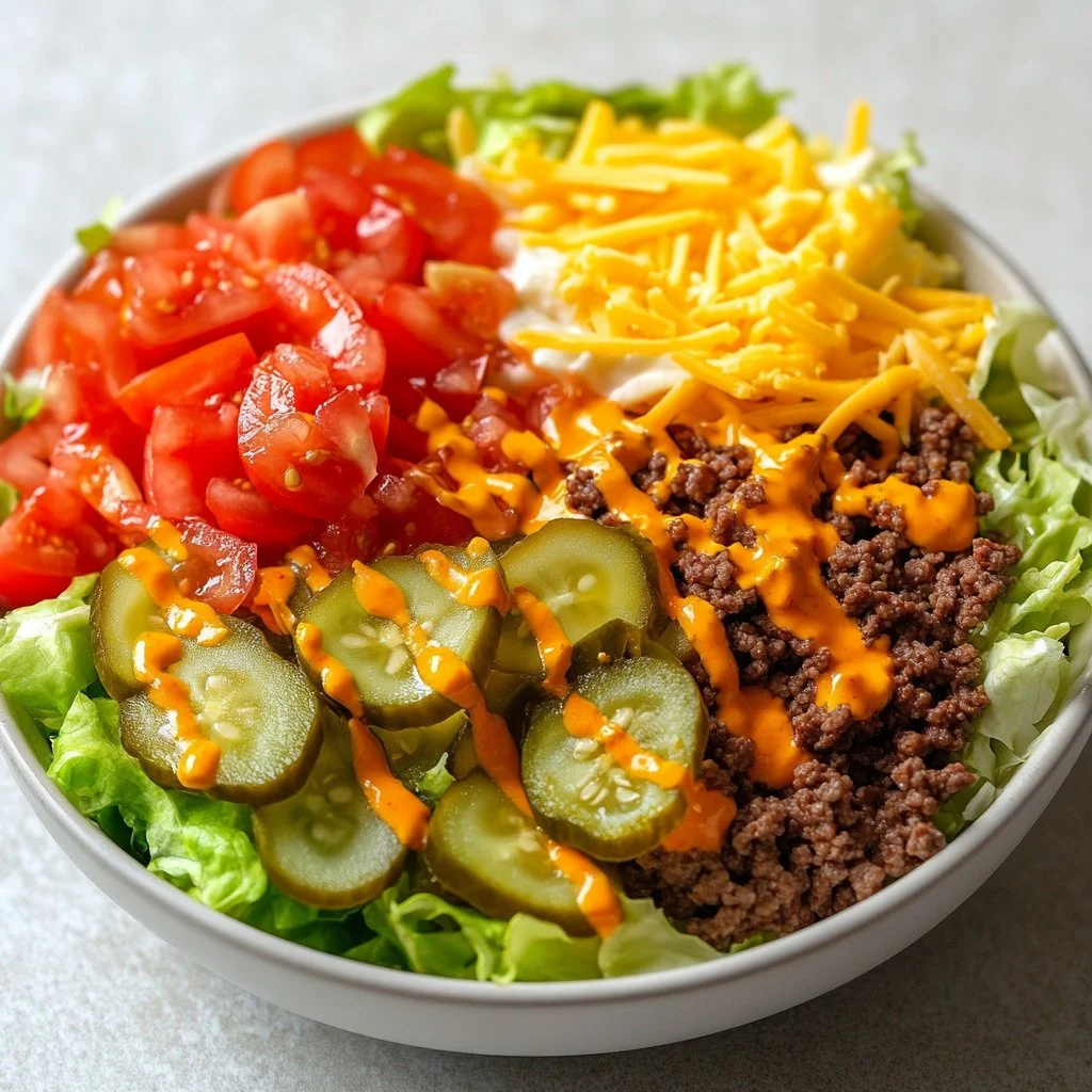 A delicious and wholesome bowl version of the classic Big Mac, featuring seasoned ground beef, fresh veggies, and a creamy sauce.