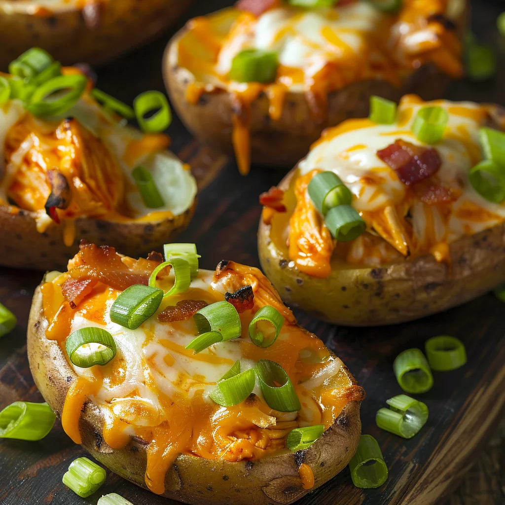 Start by preheating your oven to 400°F (200°C) and preparing the potatoes. Pierce them with a fork and bake until tender. This process takes about 45 minutes, allowing the potatoes to develop a soft interior while maintaining a firm skin. Meanwhile, season the chicken with garlic powder, onion powder, salt, and pepper before cooking it in a skillet. Once cooked, shred the chicken and mix it with ranch dressing and hot sauce to infuse it with flavor.