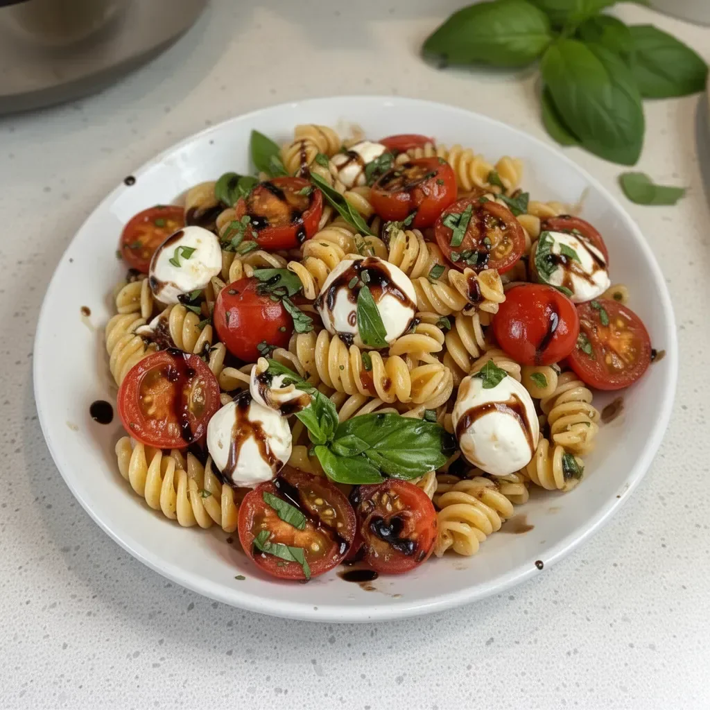 A vibrant and refreshing Caprese pasta salad, featuring cherry tomatoes, creamy mozzarella, fresh basil, and a drizzle of balsamic glaze.