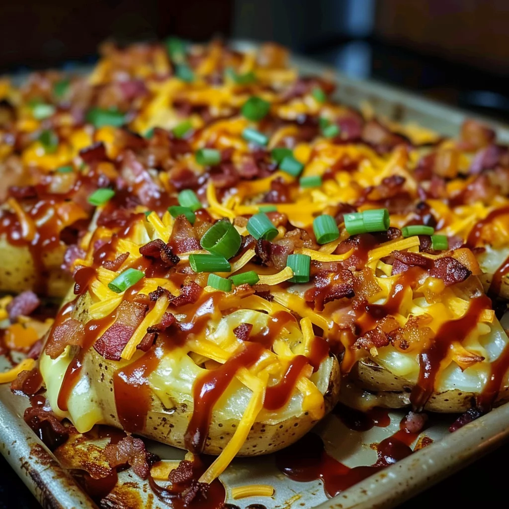- Add Cheese & Bacon: Take the potatoes out of the oven, drizzle BBQ sauce over them, and tuck the cheese and crumbled bacon into the spirals.