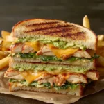 A comforting sandwich featuring tender shredded chicken, creamy avocado, and melted cheese, grilled to perfection.