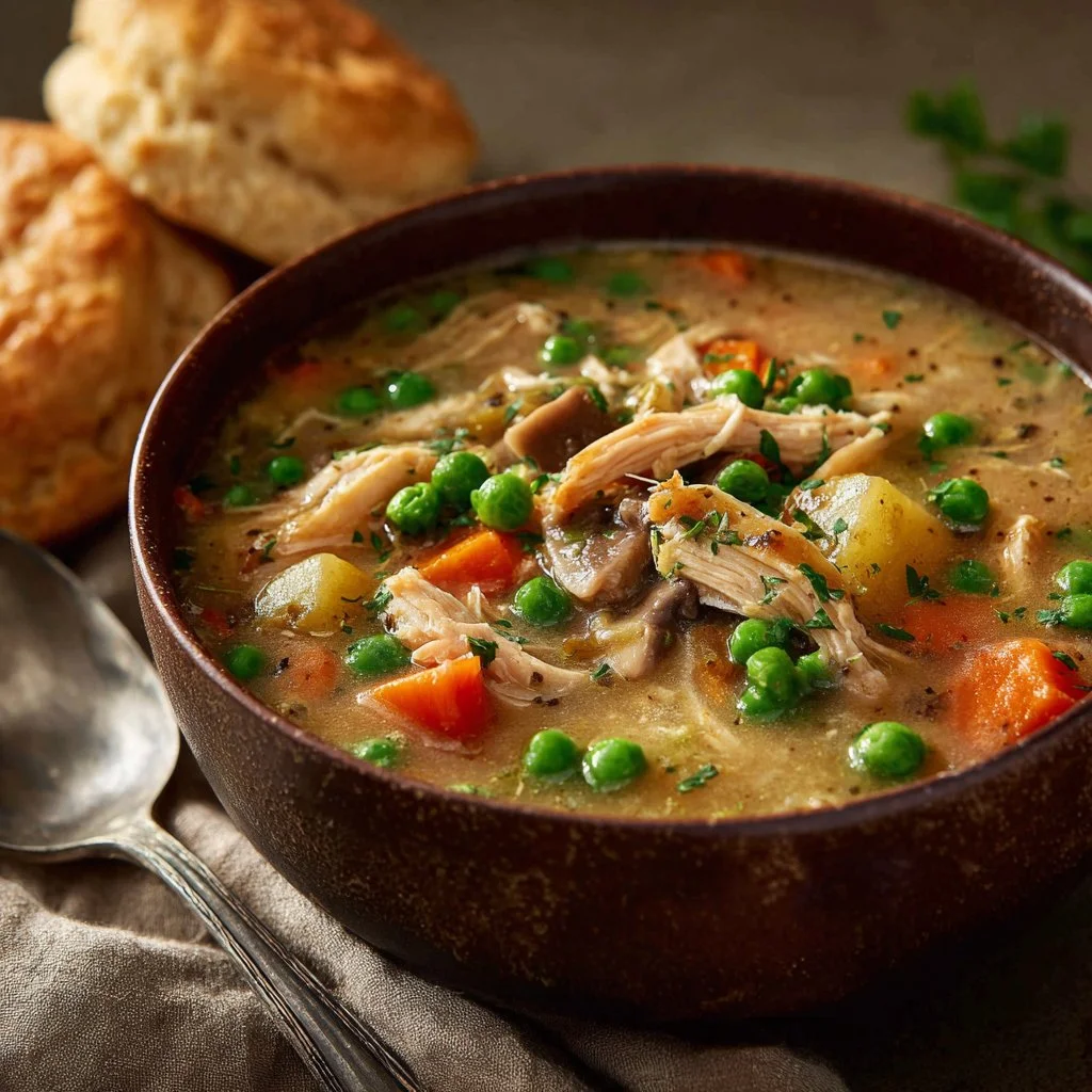A comforting Chicken Pot Pie Soup that combines hearty chicken and vegetables, perfect for chilly nights and family gatherings.