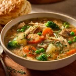 Warm and comforting chicken pot pie soup packed with tender chicken, vibrant veggies, and a creamy broth.