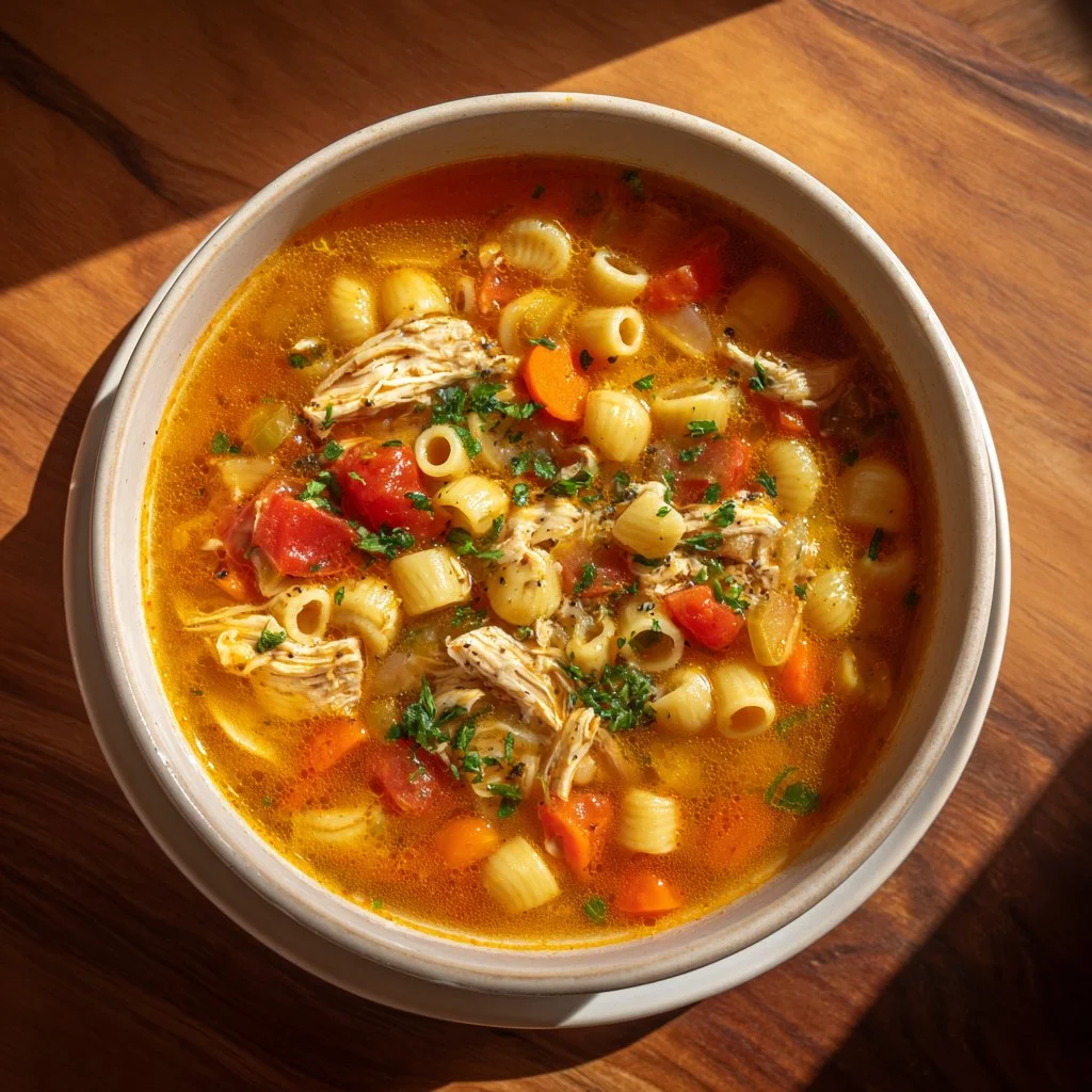 A comforting chicken soup filled with tender chicken, fresh vegetables, and savory broth that warms the soul.