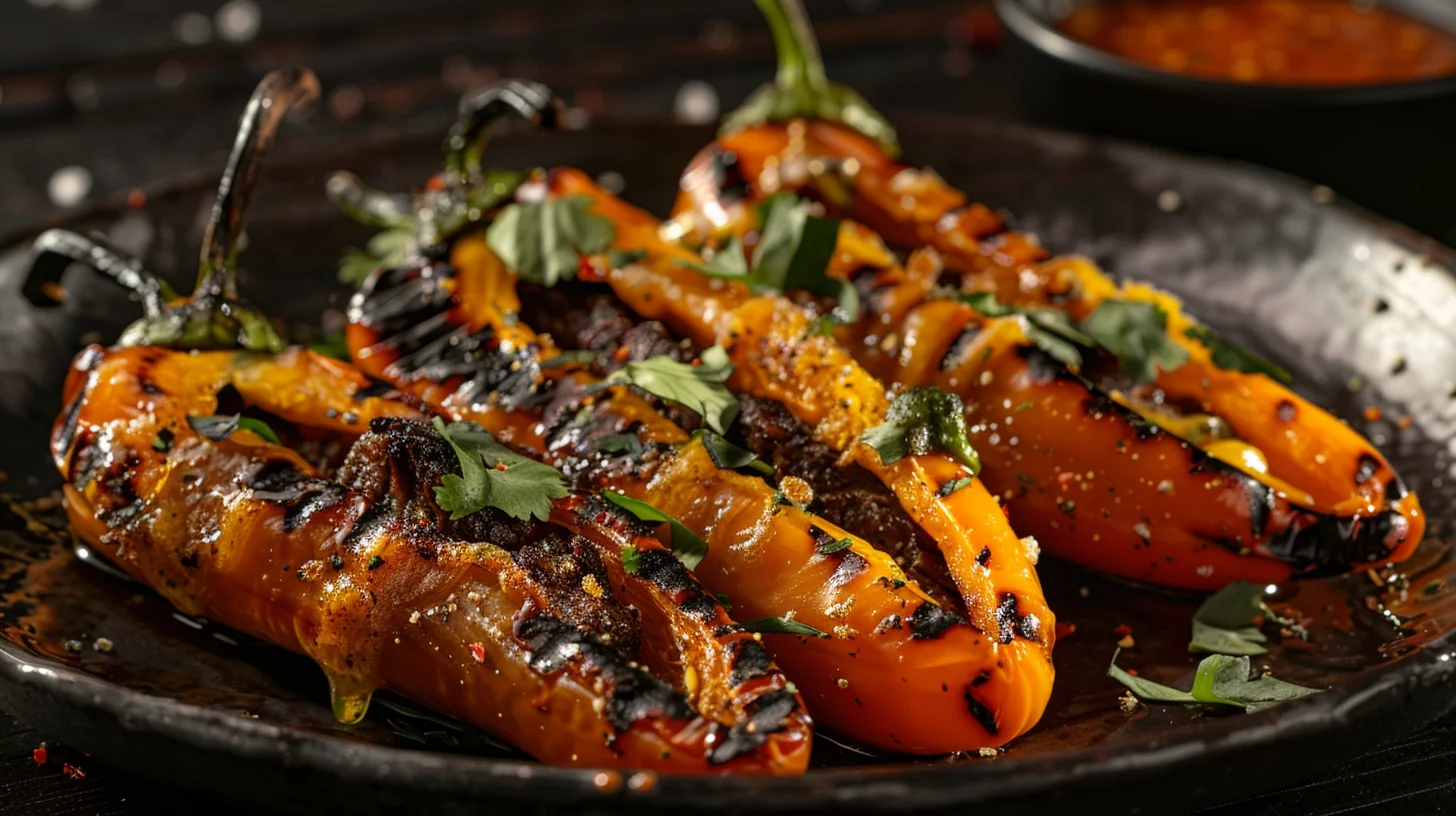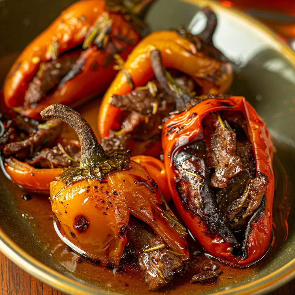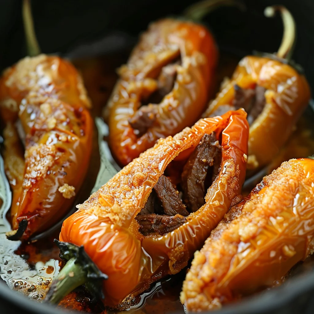 - Take out the seeds and inner membranes from the chili peppers. Insert a beef strip into each pepper.