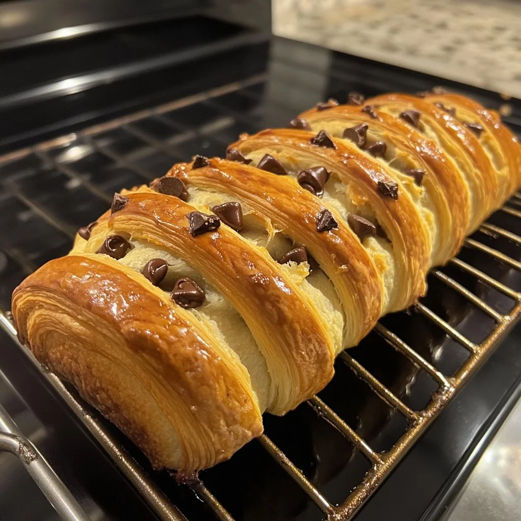 Presenting your chocolate chip sourdough croissant bread can elevate its appeal. When the bread cools, slice it carefully to reveal the beautiful layers and pockets of melted chocolate. Arrange slices on a rustic wooden board or a simple white plate, showcasing its flaky texture.