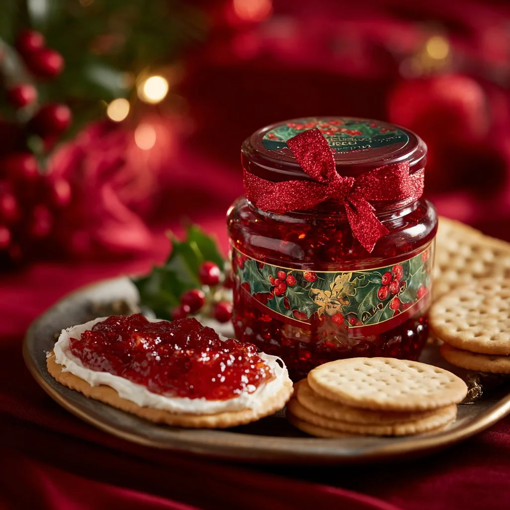A delightful blend of sweet and spicy, perfect for the holiday season, served with cream cheese and crackers.