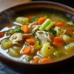 A warm and hearty chicken soup with tender chicken and hearty potatoes, perfect for chilly days.