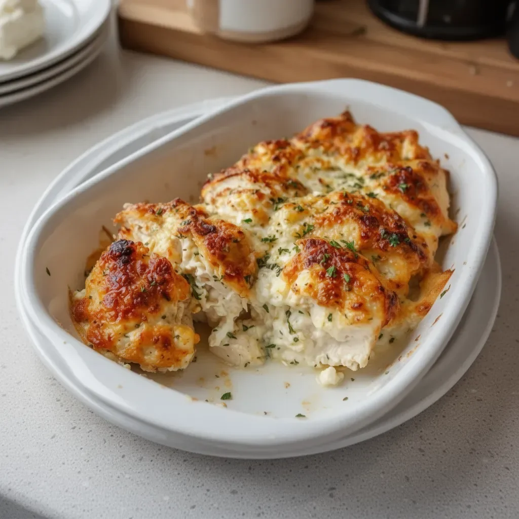 A creamy, high-protein one-dish wonder featuring tender chicken breasts coated in a rich cottage cheese and Parmesan sauce.