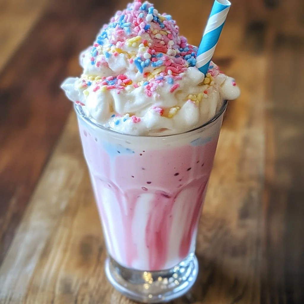 A delightful cotton candy milkshake that captures the joy of childhood memories from the carnival with its creamy goodness and whimsical sweetness.