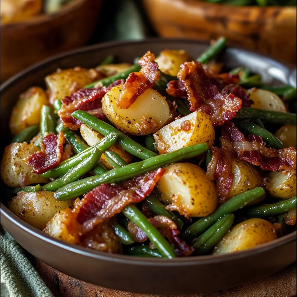 A comforting and hearty dish featuring fresh green beans, tender potatoes, and crispy bacon, all enhanced with ranch seasoning.