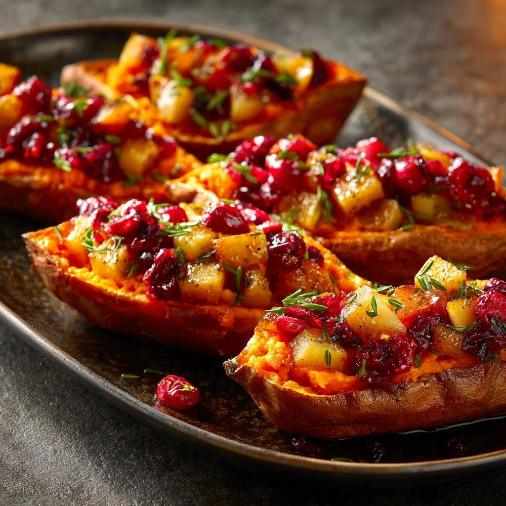 Delight in the fall flavors with these twice-baked sweet potatoes filled with cranberries and apples, perfect for any occasion.