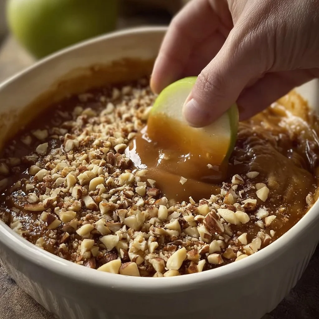 A creamy and sweet dip made with softened cream cheese, rich caramel, and topped with crunchy bits that perfectly complements fresh apple slices.