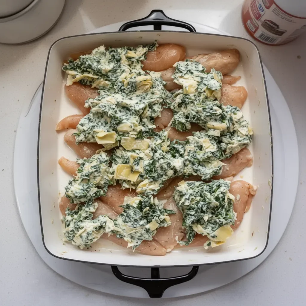 - Dollop the creamy spinach mixture over the seasoned chicken.