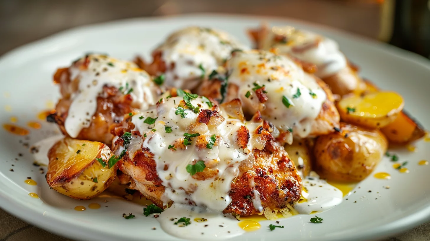 Once the mozzarella cheese has melted over your Crockpot Garlic Parmesan Chicken and Potatoes, it’s time to serve. Dish up generous portions and, for an added touch, drizzle a bit of ranch dressing on top as a garnish. This addition complements the flavors wonderfully and adds a creamy finish to the dish.