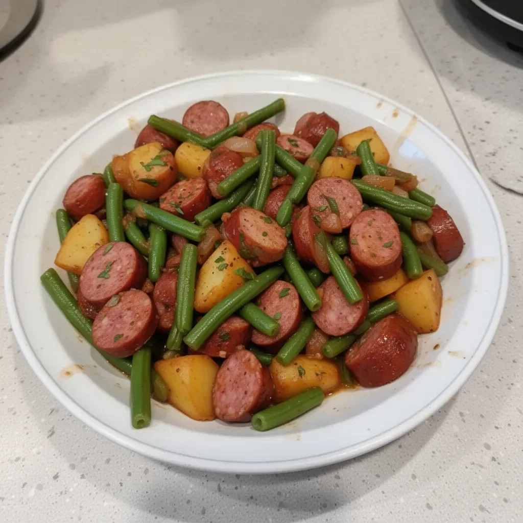 A comforting and hearty dish featuring kielbasa, green beans, and baby potatoes, all slow-cooked to perfection in a crockpot.