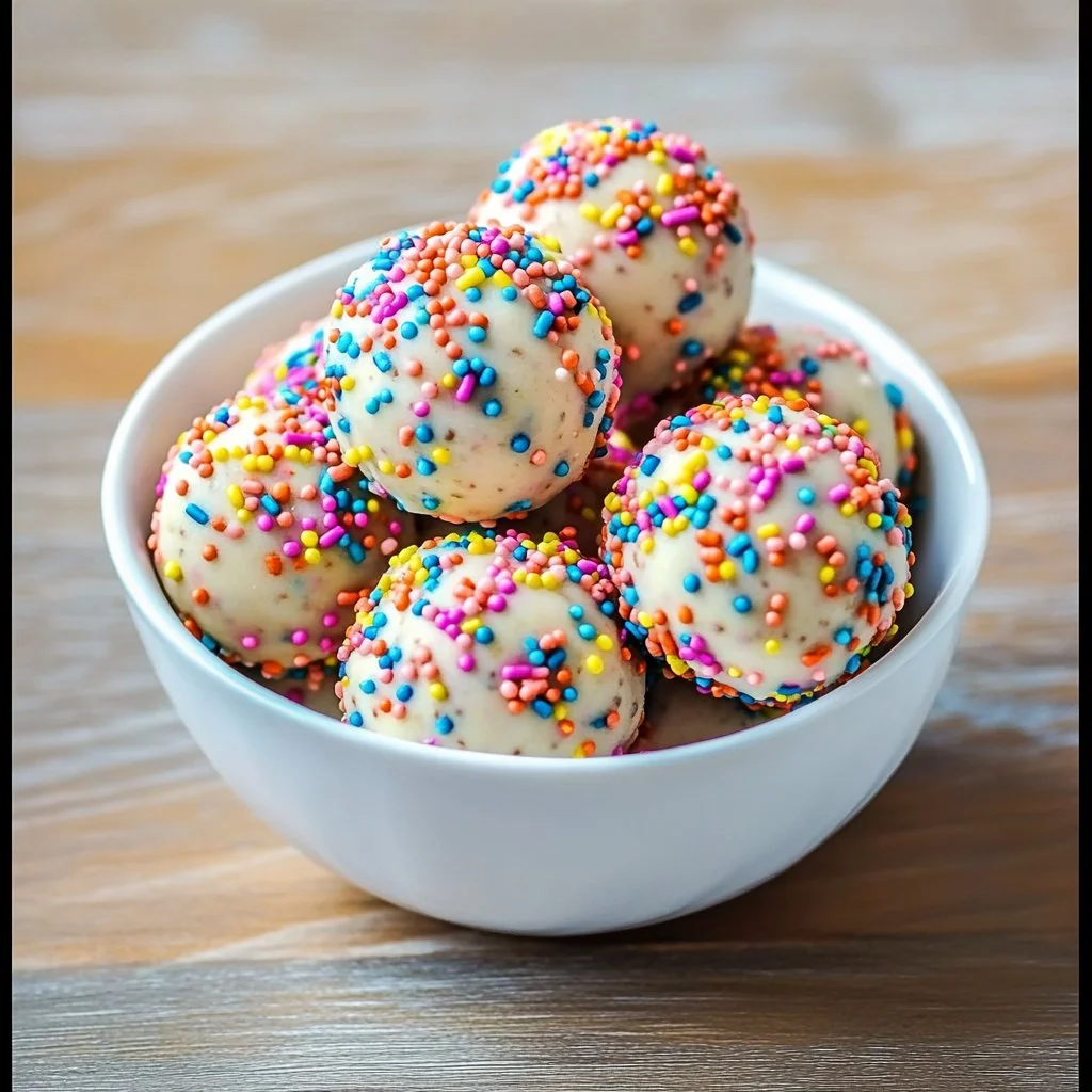 Crafting these balls fills your kitchen with aromas that mimic a freshly baked cake, making you feel like a kid again. The blend of rolled oats, nut butter, and festively colored sprinkles guarantees a treat that is as pleasing to the eye as it is to the palate. Whether you’re prepping for a birthday or simply craving something sweet, these protein balls deliver joy in every bite.