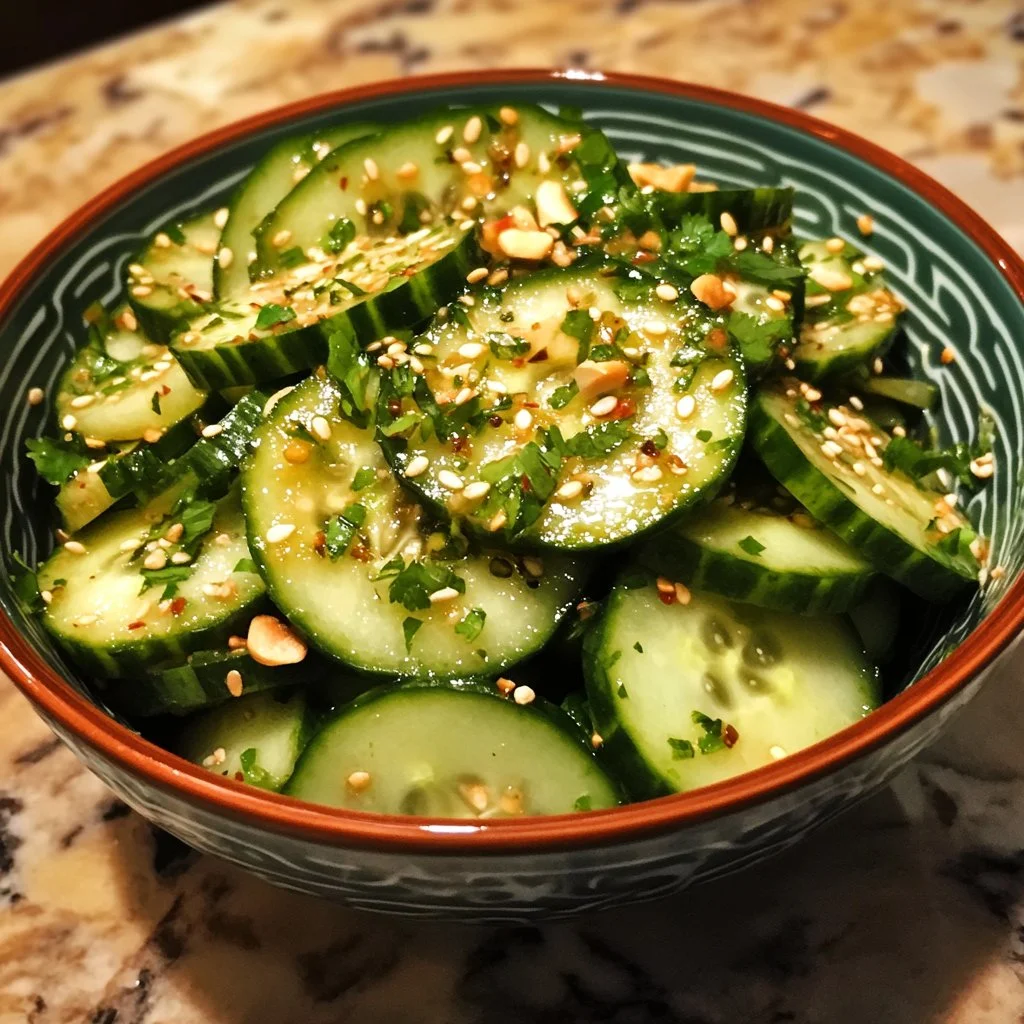 A refreshing salad featuring crisp Persian cucumbers, sesame oil, and a blend of savory and sweet flavors.