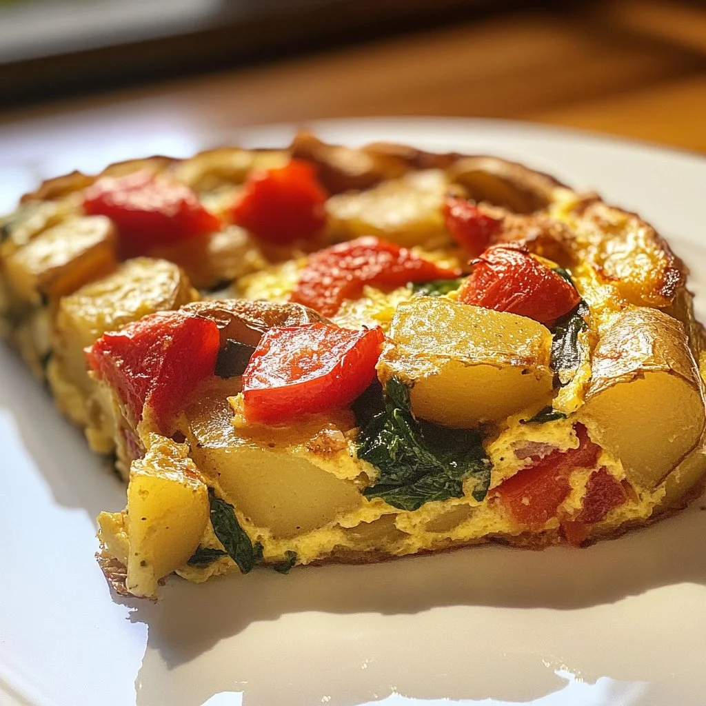 A simple yet delicious frittata made with large eggs, crispy potatoes, vibrant red bell peppers, and fresh spinach, perfect for breakfast or lunch.