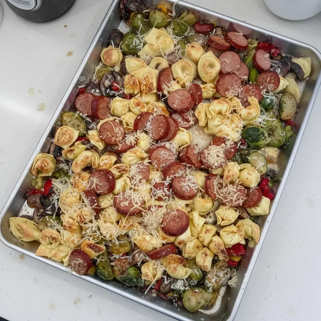 An easy sheet pan meal featuring tortellini, kielbasa, and colorful vegetables, perfect for busy weeknight dinners.