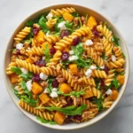 A vibrant pasta salad featuring roasted butternut squash, dried cranberries, and crunchy walnuts, perfect for autumn gatherings.