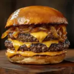 A delightful burger featuring caramelized onions, juicy beef patties with American cheese, and a flavorful sauce, perfect for any occasion.