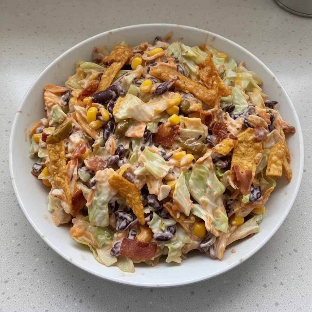 A vibrant and crunchy salad featuring coleslaw mix, colorful veggies, and zesty dressing, topped with Fritos for added texture.