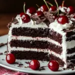 A rich and indulgent layered chocolate cake filled with cherries and whipped cream, perfect for celebrations.