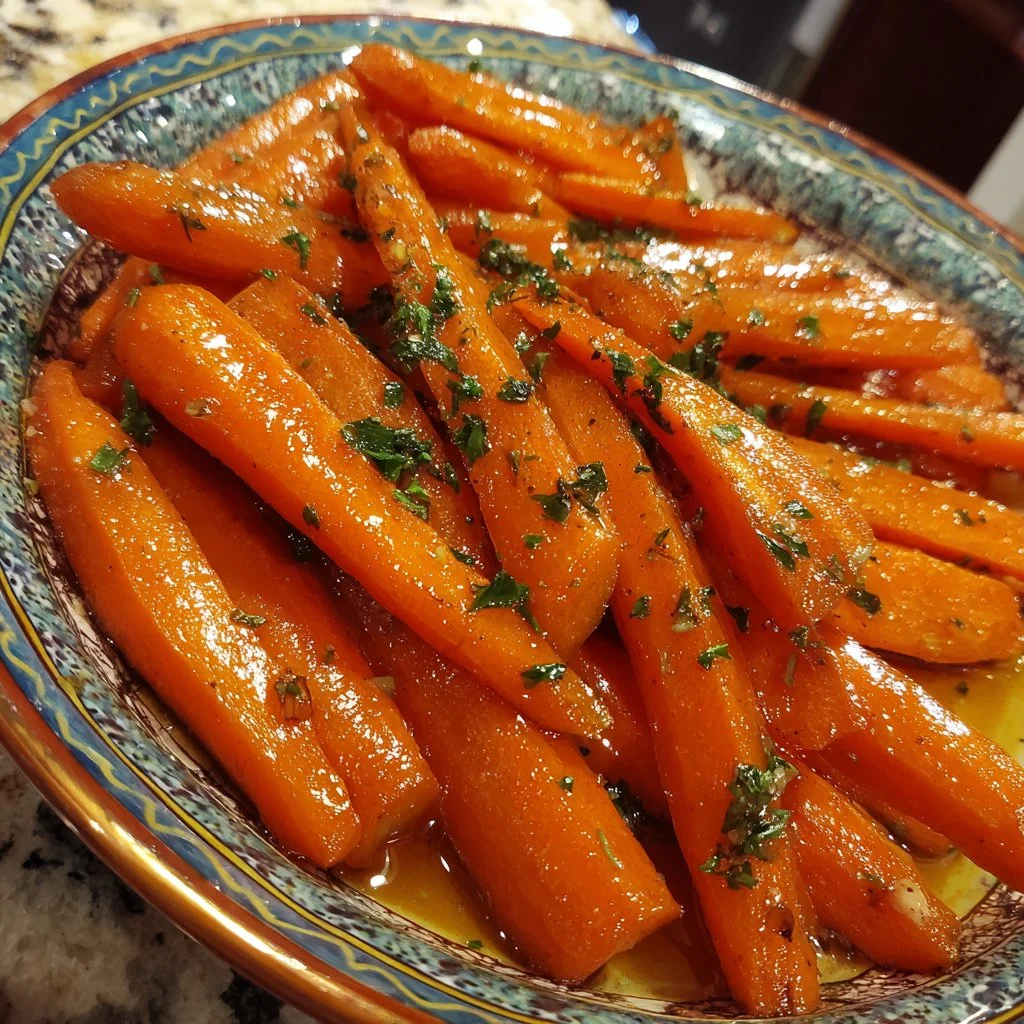 A delightful side dish featuring roasted carrots glazed with butter, brown sugar, and honey, perfect for any occasion.