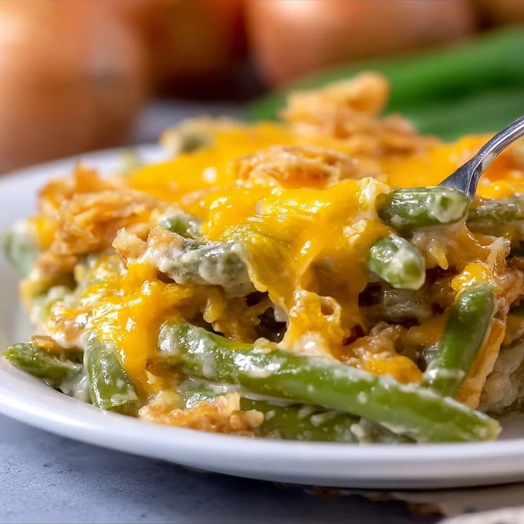 A classic holiday dish combining tender green beans, creamy mushroom soup, and crunchy fried onions, perfect for any gathering.