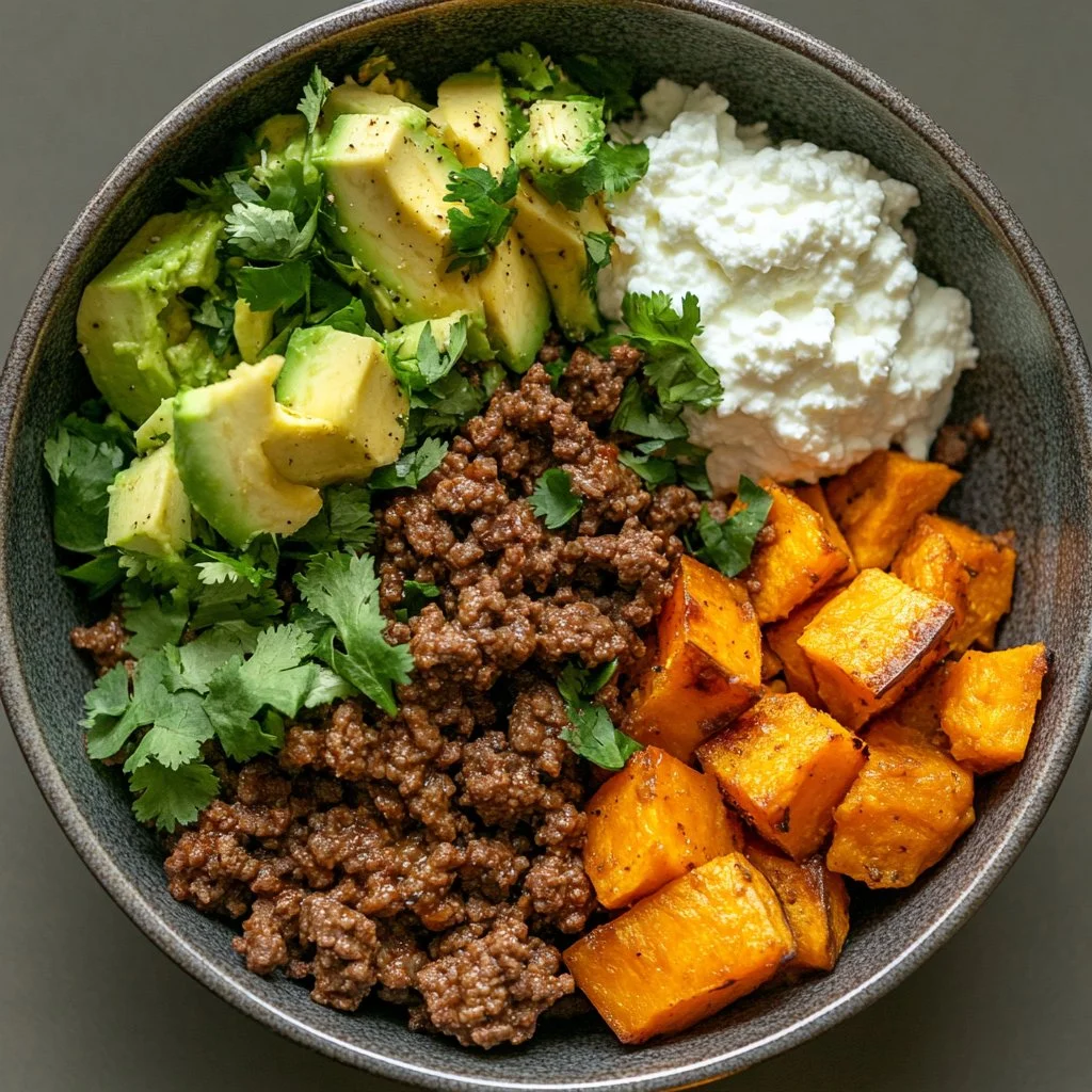 - Assemble bowls by layering roasted sweet potatoes at the bottom, followed by ground beef, avocado slices, and a scoop of cottage cheese.