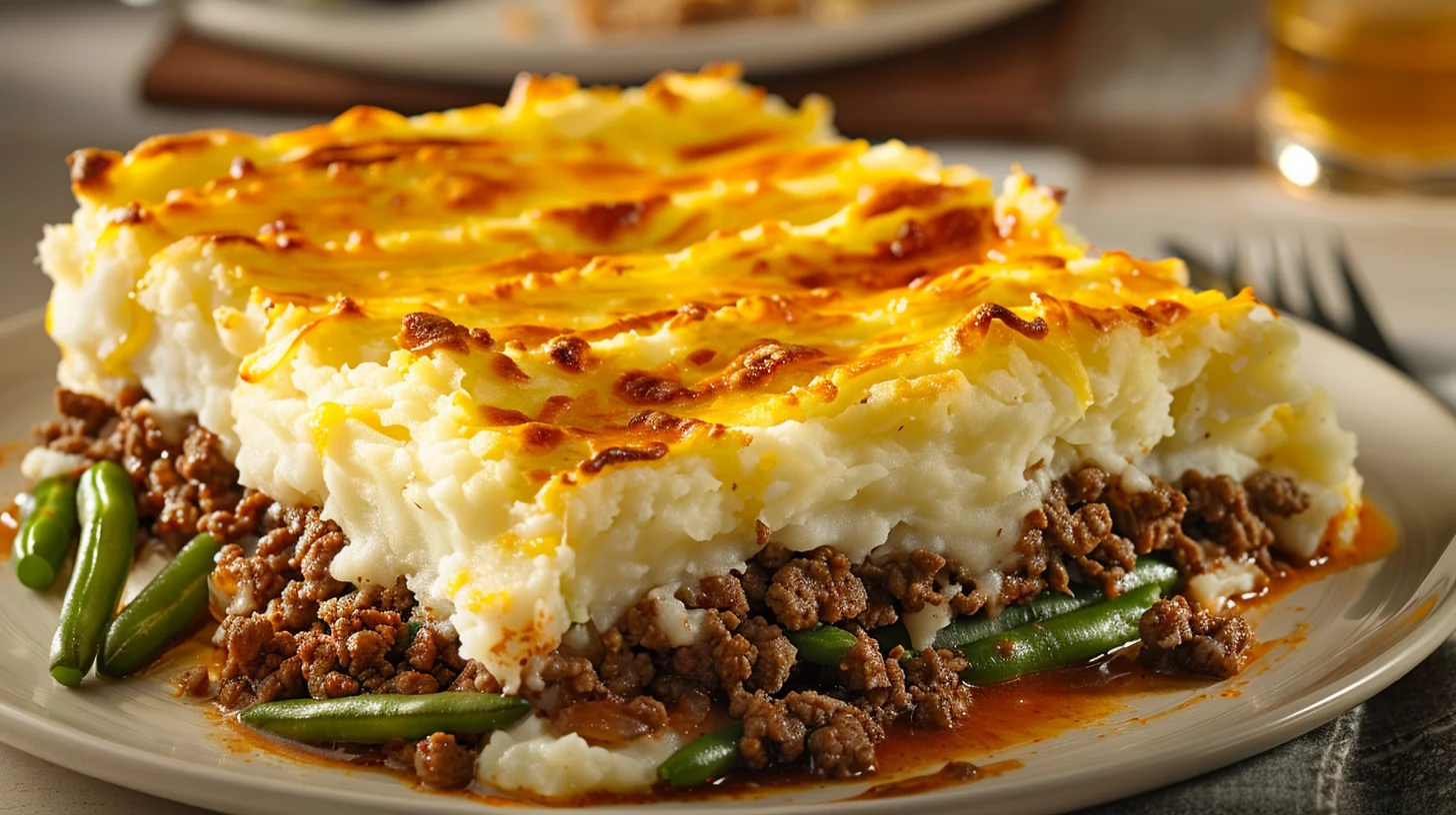 Once your Ground Beef Shepherd’s Pie is ready, let it rest for a few minutes before serving. This allows the layers to set slightly, making it easier to slice and serve. Use a wide spatula to lift portions, showcasing the vibrant layers of beef and vegetables beneath the golden potato topping.
