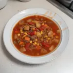 A warm, hearty soup featuring ground beef and a colorful medley of vegetables that brings the family together on cold evenings.