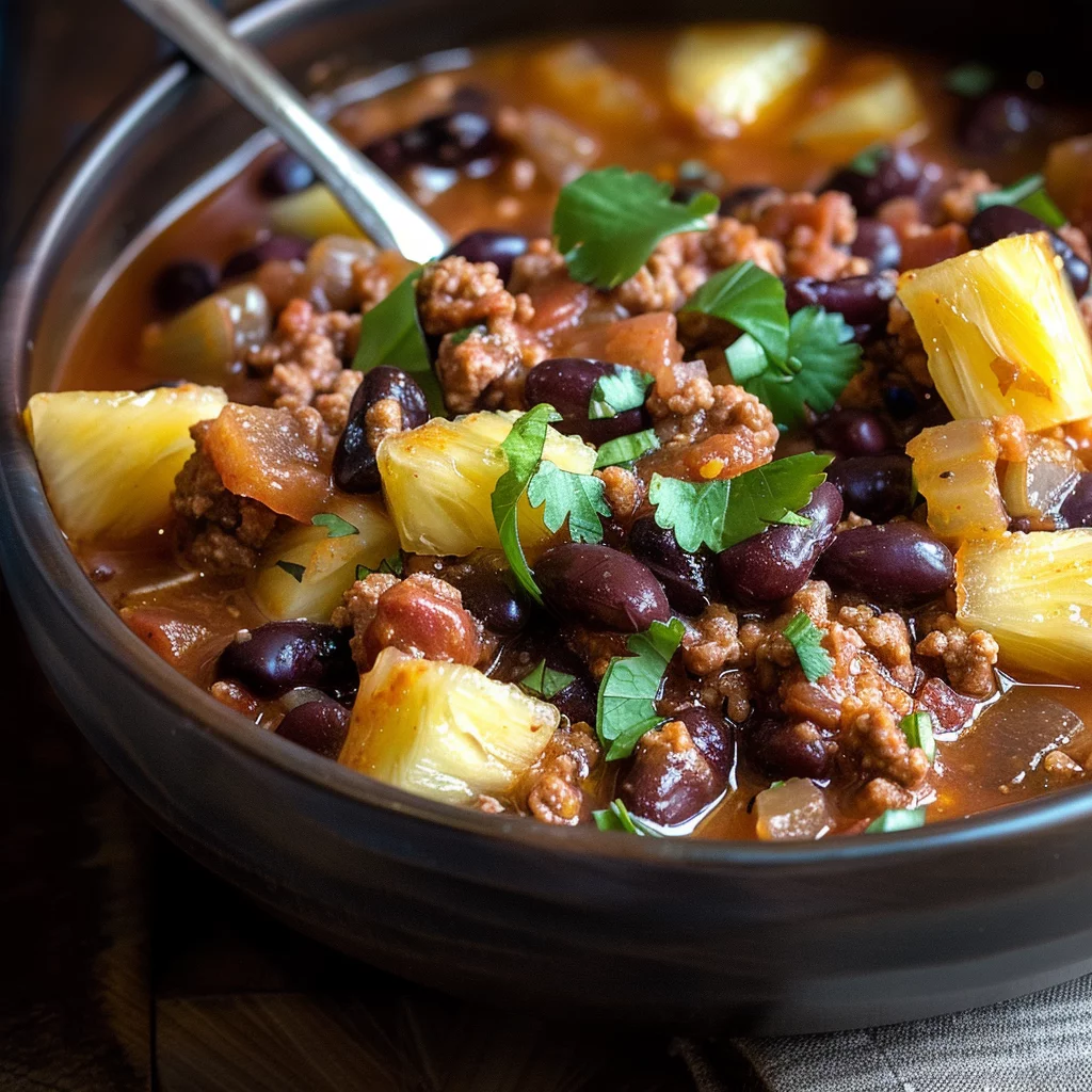 - Incorporate the diced tomatoes, beef broth, kidney beans, and pineapple chunks. Increase the heat until boiling, then lower it and let the mixture simmer for 30-45 minutes, allowing the chili to thicken and the flavors to meld. Taste and modify seasonings and salt as needed.