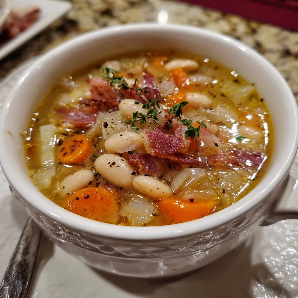 A warm and hearty bean with bacon soup, perfect for cozy nights. This dish combines tender Great Northern beans, smoky bacon, and vibrant vegetables for a comforting experience.
