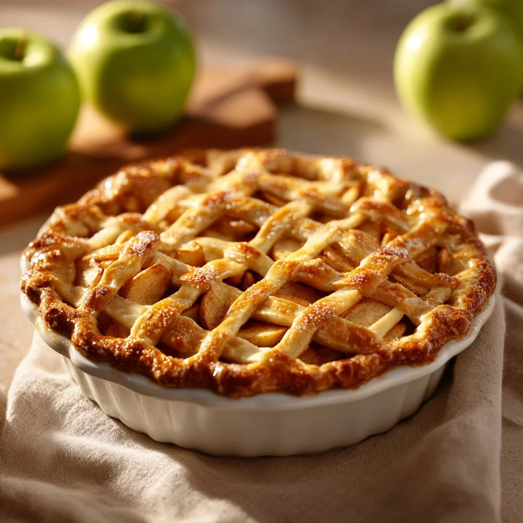 A classic homemade apple pie with a flaky crust and perfectly spiced apple filling, evoking nostalgic memories and perfect for family gatherings.