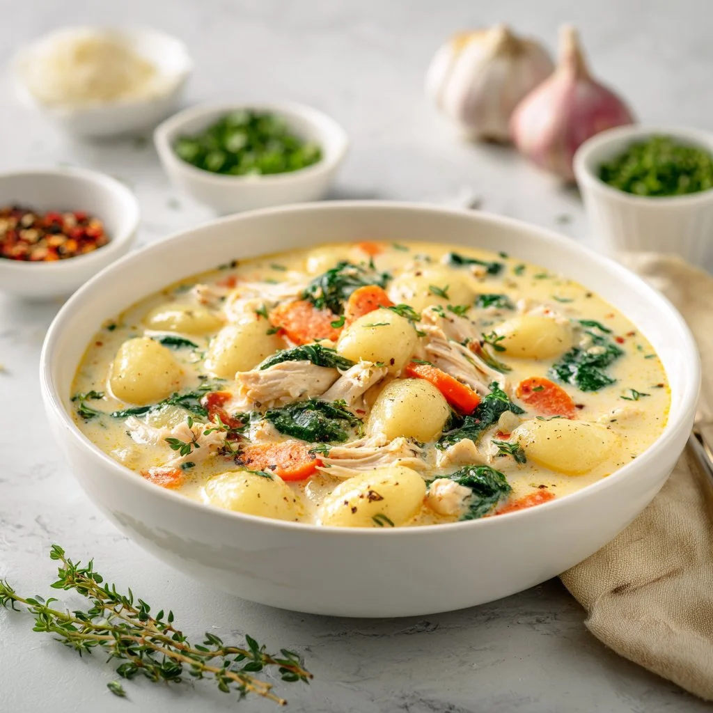 A comforting homemade chicken and gnocchi soup, perfect for snowy evenings, brimming with tender chicken, soft gnocchi, and vibrant vegetables.