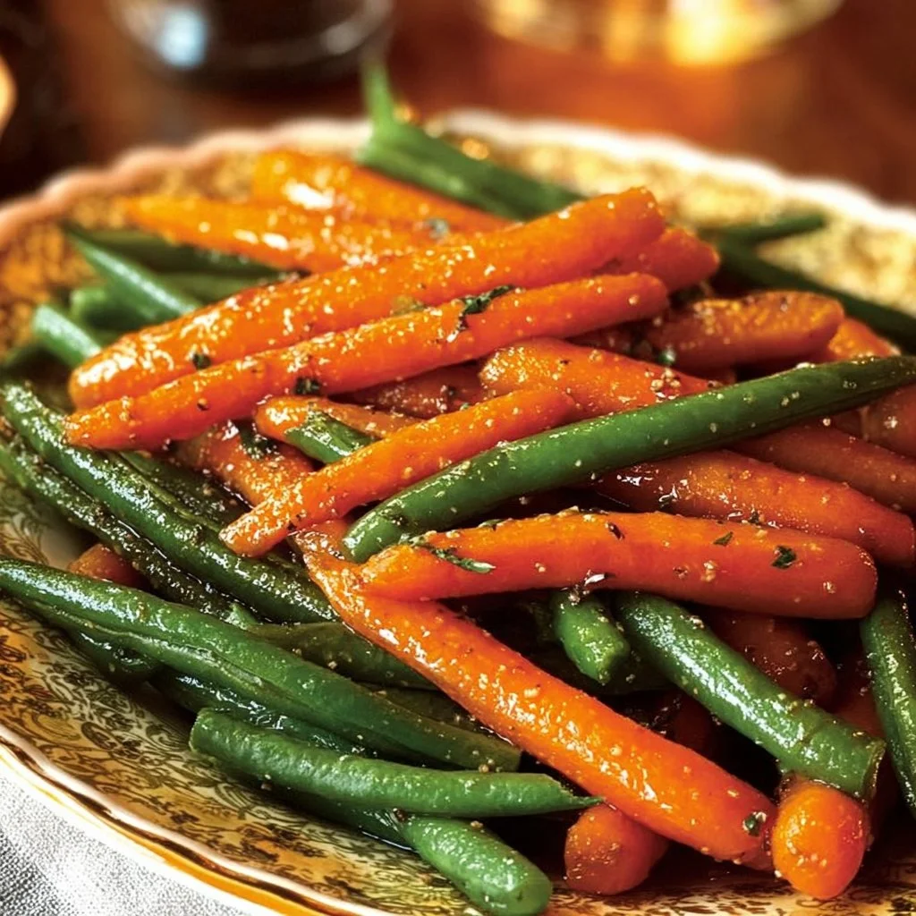 A delightful side dish featuring vibrant carrots and green beans coated in a sweet honey glaze, perfect for any occasion.