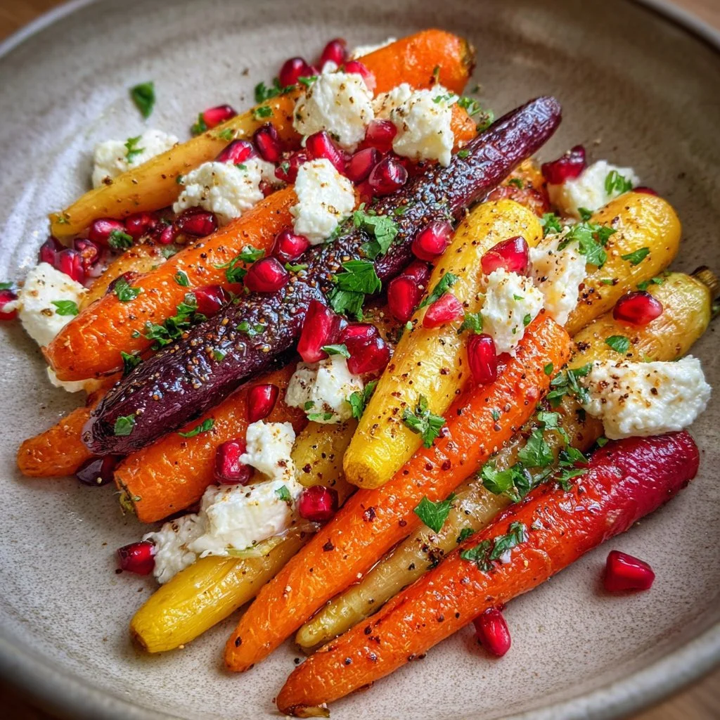 Honey Roasted Rainbow Carrots with Burrata and Pomegranate