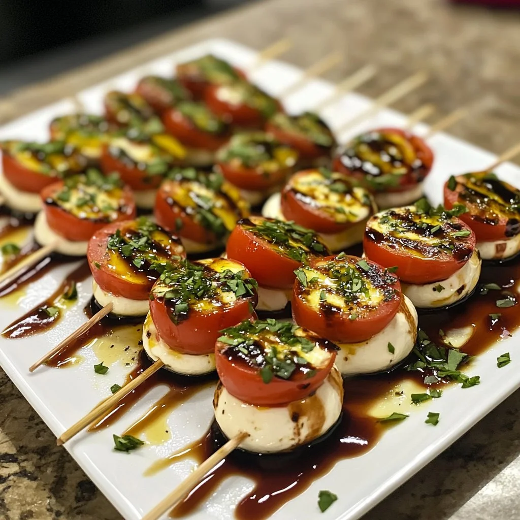 - Just before serving, finish each skewer with a light drizzle of balsamic glaze to add the perfect sweet and tangy finish.