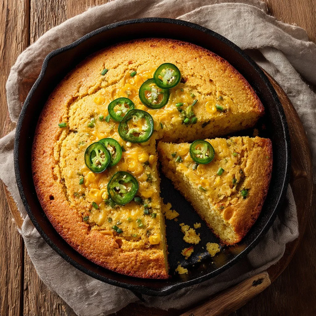 A deliciously savory cornbread with sharp cheddar and a hint of jalapeno spice, perfect for gatherings and paired with chili.