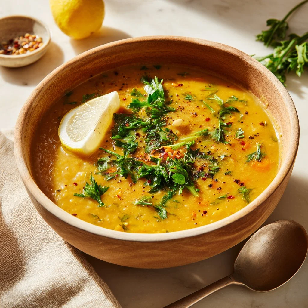 A warm and comforting lemon lentil soup that captures the essence of home cooking with red lentils, fresh vegetables, and zesty lemon.