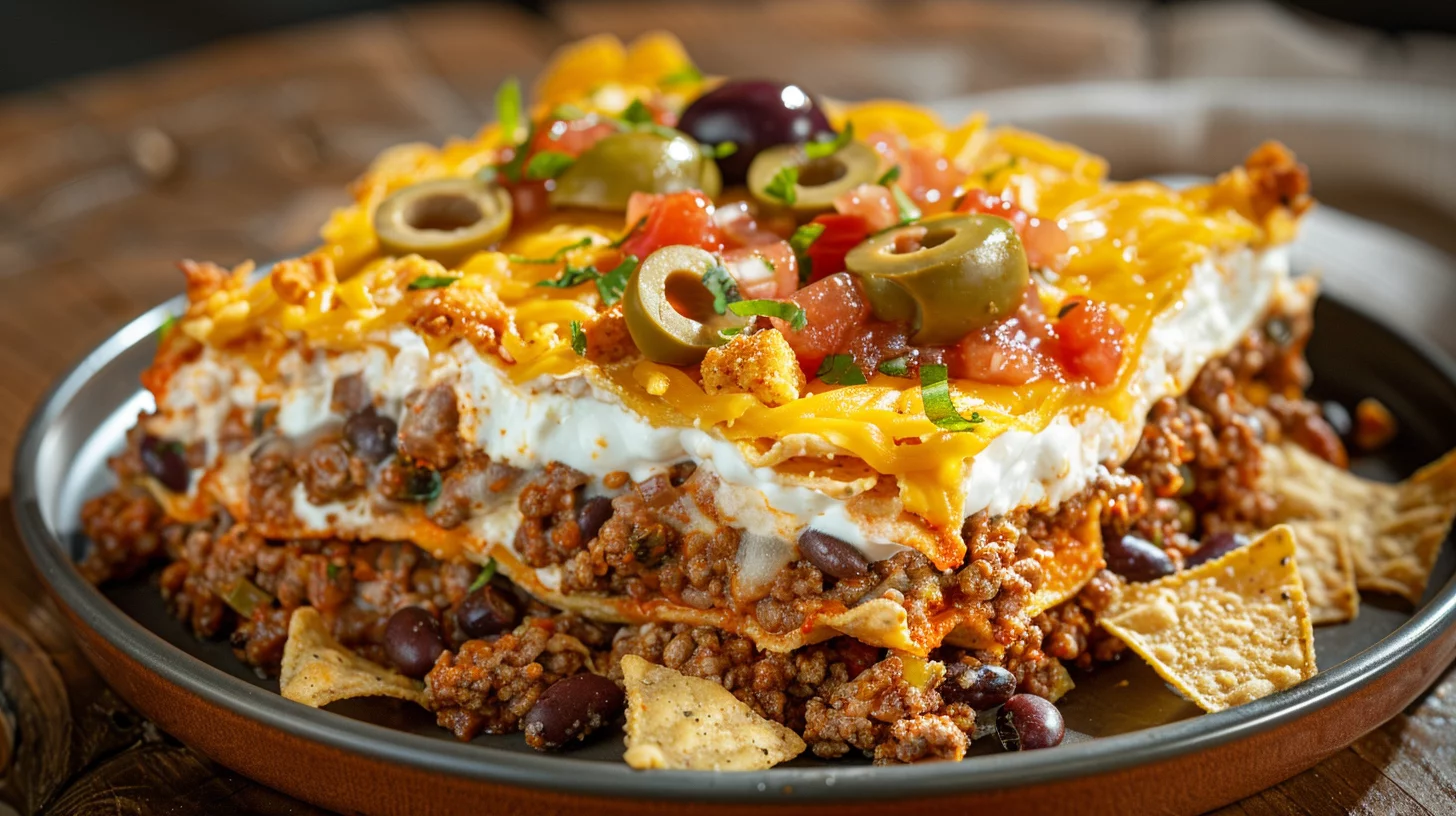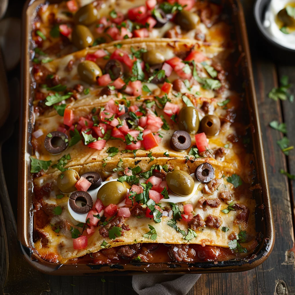 - Distribute the crushed tortilla chips at the base of the prepared baking dish, then layer the beef mixture on top. Spread the plain yogurt over the beef, and scatter the olives over that.